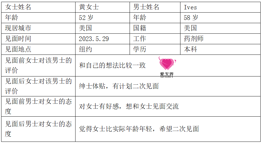 Ives来自美国,今年58岁,是一位药剂师,工作前景不错。因为阿里红娘服务组在前期的准备,Ives被黄女士的资料所吸引,主动和她联系。从刚开始交流,私聊,再到商量见面。Ives和黄女士都高度契合,他们都喜欢直接的方式,希望能尽快和对方见面。
