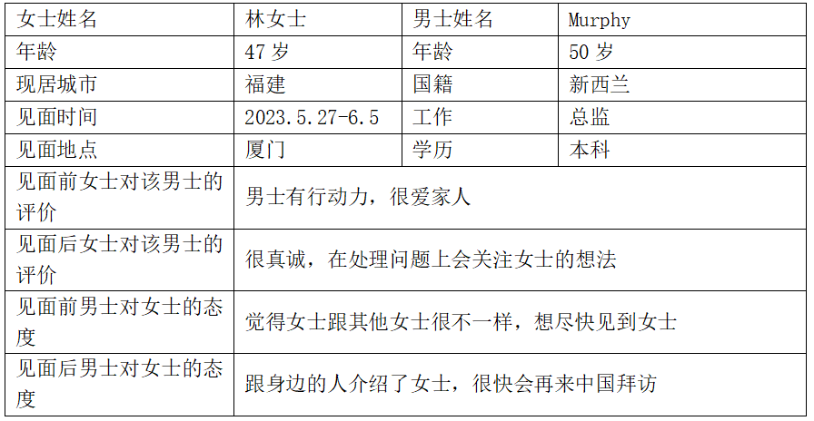 九天的见面结束,两人依依不舍,都不想和对方分开。Murphy回到新西兰后,立刻开始办理单身证明和其他证明,又订了六月末的机票,再次来中国见林女士,拜访她的家人,向林女士求婚。