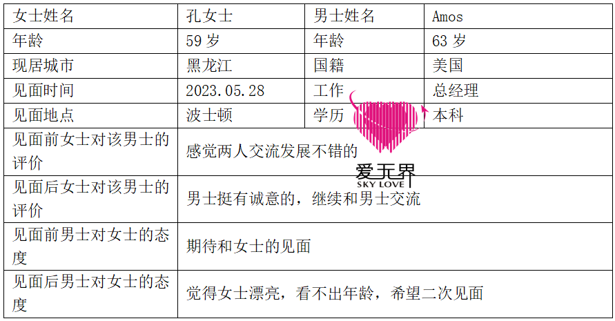Amos来自美国,63岁,是一家汽车品牌公司的总经理。他曾经来过中国旅游,很欣赏中国女性的温婉和美丽。Amos被孔女士的资料吸引,希望能结识这位东方女士,一直很热情地和她交流。得知孔女士正在美国时,Amos立即表示希望能和她见面。