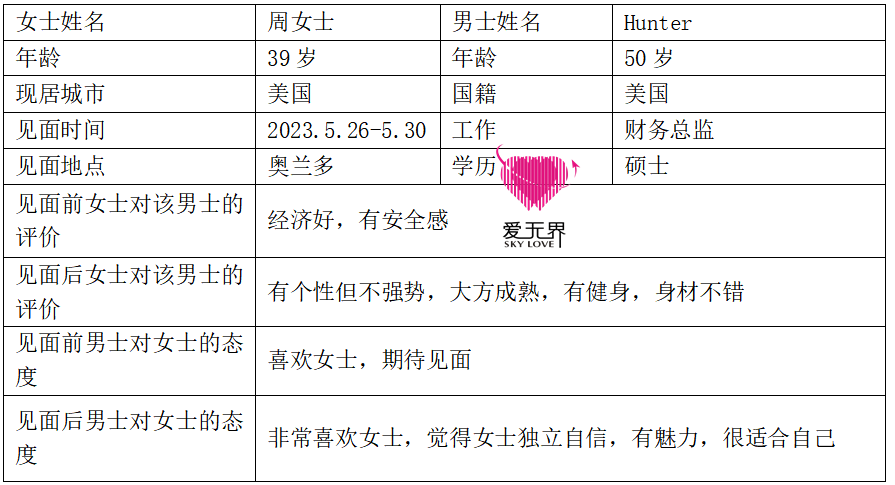 经过一段时间的相处,周女士感受到Hunter是个有个性但不强势、大方成熟,又气质好的男士,符合她对伴侣的要求。阿里红娘期待两人未来的感情进展~