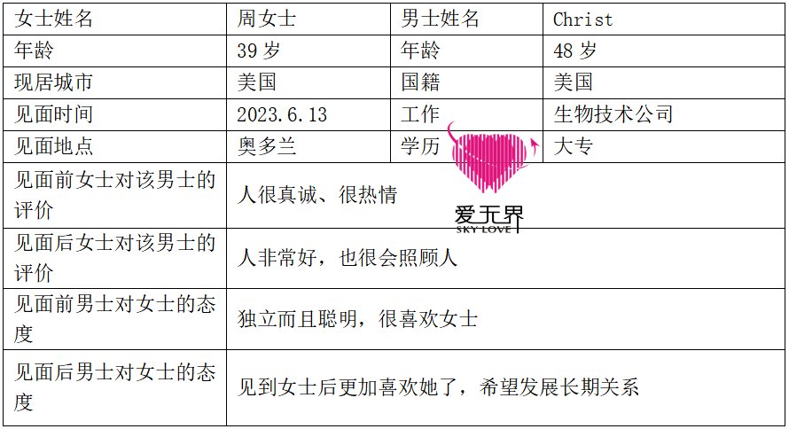 美国的Christ48岁,在生物技术公司工作。Christ真诚沉稳,谈吐不凡,遇到心仪的女士,他就会主动出击,热情地和周女士聊天,希望双方有更多的了解。