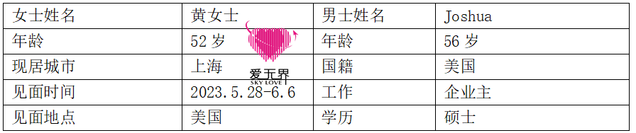 几天的见面结束,黄女士能感受到Joshua对她的真诚和经济条件不错。