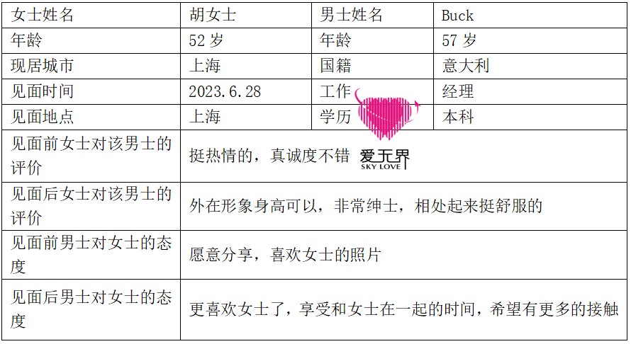 有句话说,“人生至少要有两次冲动,一次是奋不顾身的爱情,一次是说走就走的旅行。”而Buck的“冲动”就给胡女士,他实在非常想见到这位美丽的女士,2023年6月28日,他直接飞到了上海,约胡女士见面。
