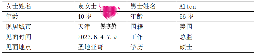 Alton来自美国,56岁,是一位总监。硕士学历的他有内涵有见识,谈吐不凡,聊天的态度也很积极,每天只要有空就找袁女士。这也让一向要求高效的袁女士很满意,觉得和Alton的步伐一致。