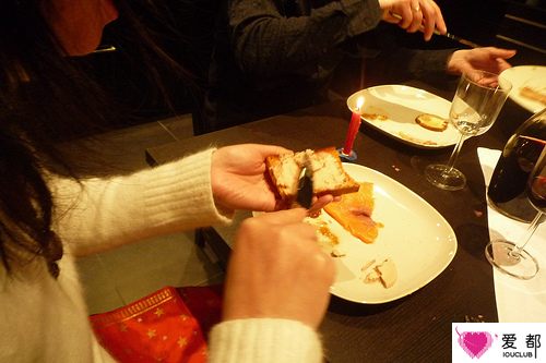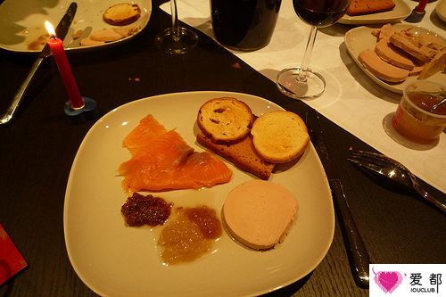 他可一直没告诉我这鹅肝酱该是切成一小块一小块,再放在面包上,可是为什么没有像芝士那样有一块块的包装,早知道我还省力气呢, 把面包均匀涂上一层酱也不容易啊。