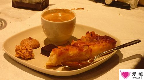 最后甜点:一杯 咖啡,一枚香梨杏仁蛋糕、一块蛋白杏仁甜饼搭配一块黑巧克力和果仁脆糖
