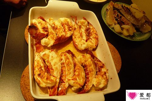 家公的拿手好戏是: 白兰地烤大龙虾.刚烤出炉,把上好的白兰地加热后浇到大龙虾上,再点燃,让白兰地的香味熏入龙虾中. 带着很好闻的酒香,还有淡蓝色的火焰