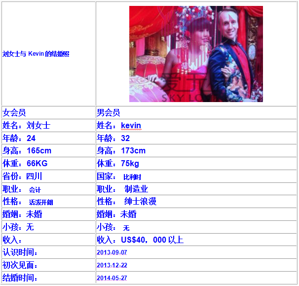 年轻漂亮的成都刘女士是2013年8月入会的,在阿里红娘的官网上也发布过关于刘女士的见面动态!刘女士和来自比利时的Kevin是在2013年9月认识,2014年5月27日,她和Kevin牵手成功,登记结婚!