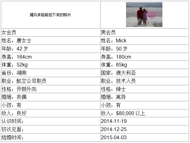 Mick于2015年3月28日再次来中国,这次过来是与唐女士办理结婚登记。两个人来到广州的澳洲领事馆办签证,也特意过来阿里红娘,邀请当初服务她的咨询顾问、情感老师和翻译老师一起聚餐,见证她的爱情成果!Mick真是一位幽默有风度的绅士,他说,我娶了一位美丽的中国妻子,这里是我妻子的婆家,我会经常回来的!哈哈,逗乐了在场所有人,众姐妹一致点赞!祝福唐女士,终得一心人!