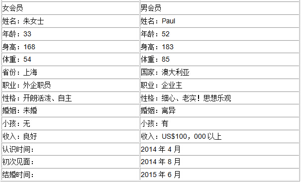 年轻时尚的朱女士在与澳洲的Paul第二次见面之后定下了2015年1月结婚的计划。自2014年8月见面后,分隔两地的一对恋人已无法忍受长期的分开,于是2014年的11月,Paul迫不及待地又飞过来上海了,向朱女士求婚,安排订婚宴,宴请朱女士的亲朋好友!