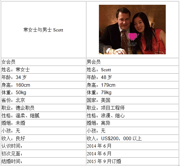 自2014年4月加入阿里红娘以来,因为甜美的笑容和清新的文艺范儿,一直很受平台男士的欢迎!而她跟来自美国48岁的Scott相识于2014年的夏天,当时Scott因为公司的项目去到北京出差,他在网站上第一眼就被常女士的照片和资料吸引,大胆的发出了见面邀请!而常女士当时受邀见面的决定,让两人的命运从此紧密连接上。第一次见面两人的感觉都非常的好,Scott带上整整一箱子的礼物给常女士!虽然Scott比常女士要大上许多,但就是这份成熟另女士喜欢上,常女士说,他是个可爱的山姆大叔!(第一次见面: