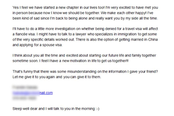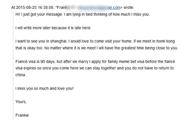 很开心,吴女士将会是又一位即将嫁出国的姐妹,这次她去的地方是美国洛杉矶,嫁给一位律师男士!类似这样情意浓浓的信件,我们每天都在处理,这是真心诚意的力量,字里行间可以感受到彼此的思念和对未来的憧憬。吴女士已经结束服务期,但和阿里红娘一直保持着密切的联系,这里是每一位嫁出国的女士的娘家!