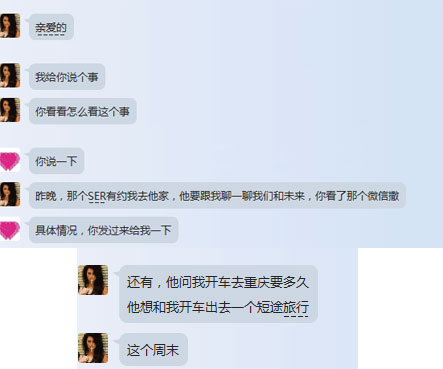 我们发了茜茜的生活照给男士,男士觉得茜茜很漂亮,希望在成都期间有机会见面。茜茜很爽快地答应了邀请。
