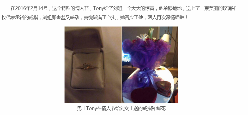 第一次见面是在深圳,Tony送上了定情的戒指和礼物,而这次见面是在刘姐的家乡四川成都!Tony从温哥华起飞,飞到上海转机飞抵四川,如同第一次见面,这次Tony带给刘姐的惊喜一样不少,一枚专门定制的钻石大戒指!真真正正地套在了刘姐的无名指上!