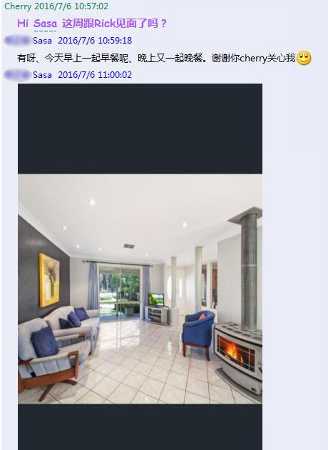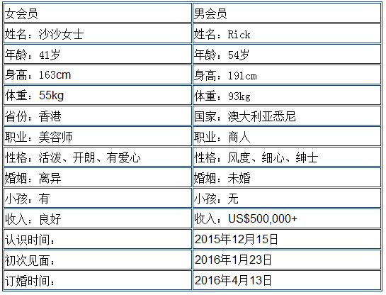 2016年7月5日,来自香港的Sasa跟来自澳大利亚悉尼的54岁男士Rick 在香港第四次见面了!自3月初Rick求婚成功,为Sasa戴上戒指后,男士回悉尼便开始着手买别墅,房子置办好了,男士又来香港了,止不住的思念!sasa晒完戒指,又开心地与教练晒房子咯!一切准备就绪,只待sasa的澳洲签证了,9月份两人计划在澳洲见面,办理结婚!