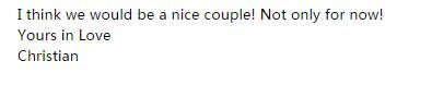 男士为了孙女士在学习中文,也借助翻译软件用中文给女士写信,而男士很心细的发现女士的中文名拼音sun(孙),他对女士说:“我猜你叫“sun”是因为太阳的缘故吧,sun huanhong。你如同阳光般璀璨,就这样进驻到我的内里,照亮了我的整个灰暗的世界,谢谢你的出现,我会很珍惜的!”这位德国大叔的想象力真丰富,还带着满满的爱意,让孙女士很动容!