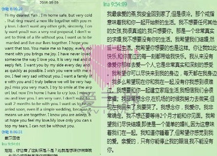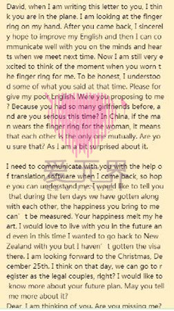 David求婚时说了很多很多,但激动的Yan没有听进去!Yan担心自己会错意,于是在David回国后,Yan把心里的想法写下来,翻译老师翻译成信件发给David。