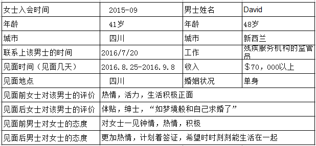 缘分总是在不经意时悄悄来到身边,2016年7月20日,Yan和来自新西兰,48岁的David相遇了。David对Yan一见钟情!也许是Yan的眼神如磁铁般深深地吸引住男士,让David无法自拔,所以哪怕刚开始Yan只是简单冷淡的回复,David依旧坚持着每天等待和Yan视频,视频的时候David紧盯着Yan,眼神热烈,一刻也不离开。