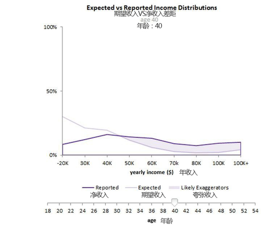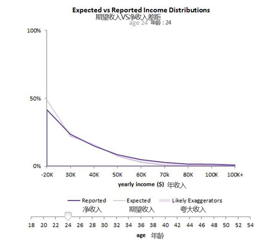 人们总是谎报收入,而且年纪越大,谎报得越来越厉害。以下对比了 OkCupid 上两个不同年龄段(24 岁和 40 岁)的人的实际收入和声称收入的差别。