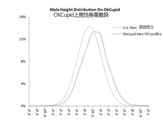 身高这件事其实是很难证明的,因为一个在线约会网站不可能拿着卷尺去注册会员家里测量人们的实际身高(听就来就神经病)。但是他们在“男性身高与性生活活跃程度”曲线图上对比了普查出的美国男人和 OkCupid 上的男会员(声称的)身高差别。