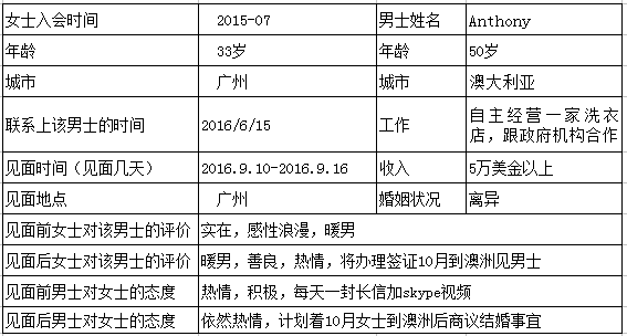 2016年6月,琳遇到了来自澳洲的Anthony,Anthony今年50岁,1米8的身高,自己经营一家洗衣店,与当地政府合作洗衣业务。Anthony有点胖胖的,很开朗,总是露出暖暖的笑容。琳看到Anthony第一眼已被他温暖的笑容逗乐,她说他很像大白,她挺喜欢肉肉的大白。Anthony也被琳直爽的性格所吸引,两人的情感日益加深,迫切希望能真实拥抱彼此。