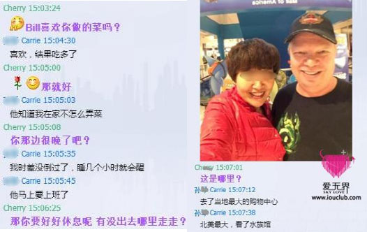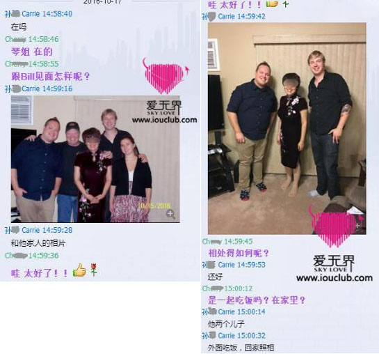 孙姐和他的男朋友,来自美国的51岁男士Bill,自第一次见面后原本约定7月见面,但因Bill的工作原因推迟到9月了。2016年9月6日-15日,Bill从美国飞到重庆。孙姐和Bill在重庆度过了愉快的时光,孙姐越来越觉得Bill很用心,对她很耐心,包容她蹩脚的英语,尊重她,爱护她。Bill出手大方,也给我们分享照片,女士记得Bill喜欢吃辣,特意带他去吃当地火锅,两人还去了云南旅游。旅游的过程感觉非常好,感情倍增,回来后孙姐带Bill见父母亲人,并已计划好10月就会飞去Bill所住的城市(圣克劳德市),未来会办理未婚妻签证。