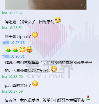 来自英国42岁的Paul体贴、细心、热情。在8月份冯女士英国之旅后,Paul希望每天与冯女士视频,缓解他无时无刻的思念之苦!冯女士每次像小女孩一般,尽情撒娇,享受着Paul对她的宠爱!