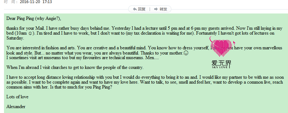 男士来自德国,54岁,女士高萍44岁来自新疆乌鲁木齐。 两个人虽然相识只有一个多月但是男士对女士特别的热情。 男士197cm和女士的身高很匹配,做税务顾问工作,经济收入不错。 女士英语不是很好但是男士不介意而且愿意教女士。女士也比较担心以后移民德国要学德语,但是男士安慰女士说移民要求的德语很简单,到时候会帮助她的。现在最重要的是发展两个人的感情。 男士也有计划要来中国,想看看和女士是否能长期发展下去。那我们就期待吧。