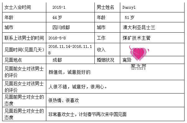 2016年5月初,收到来自澳洲男士Darryl主动发来的信件。Darryl,51岁,身高1.8m,是煤矿技术主管。Darryl积极主动,看到冯女士的信件都有第一时间回复。两天时间冯女士已了解Darryl的基本情况。冯女士还偷偷和教练说,英语能力有限,有点招架不住Darryl的热情了!