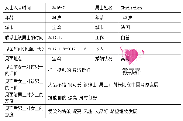 新的一年新的希望,2017年第一天,平台上一句简单的自我介绍,开展了张女士一段美丽异国约会。Christian42岁,一位来自法国的帅哥,全身上下散发出浪漫的气息。性格开朗活泼的张女士遇到健谈的Christian,经过一个多星期的聊天交流,互相都有了一些基本的了解,Christian告诉张女士,他人现在就在北京,他愿意放下公司的工作,马上到宝鸡见面。见面对于张女士来说来得太快,似乎是Christian随意一句话,于是并没有放在心里。笑笑回答,“好啊,欢迎你”。