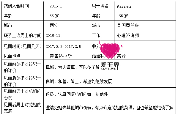 初登平台,范姐的情感之路并不是一帆风顺,因为各种各样原因与多个男士擦身而过。虽然有遗憾,但范姐并没有气馁,和教练分析原因后,调整好心态,提升自己,等待自己的缘分。2016年的11月,范姐认识了来自美国奥兰多男士Warren,刚接触范姐对于1米75的Warren,并没有怦然心动的感觉,虽然教练和翻译一致认为Warren有诚意,可以交流了解的。在接下来的通信中,Warren也表现出谨慎的一面,但很认真回复范姐的每一封信件。一个多月通信时间,范姐也被慢慢被这真诚的男士所感动,开始期待着两人的见面。