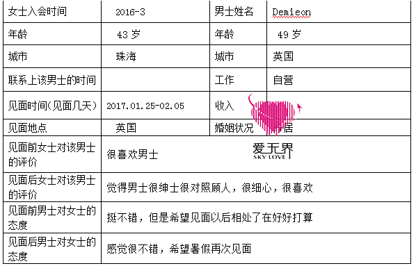 来自珠海的孙女士在人生的43岁决定走跨国交友寻找她的爱情。2016年3月,孙女士加入阿里红娘从上平台开始便得到许多男士的关注和来信。孙女士对男士有自己的要求和期望,在选择和沟通过程都较为谨慎,在入会后的半年里,没有确定交往的男士。直到9月,在教练推荐了一位来自英国伦敦的男士Demieon给孙女士后,孙女士说她迎来了属于自己的缘分!