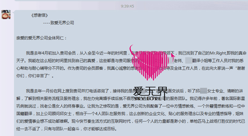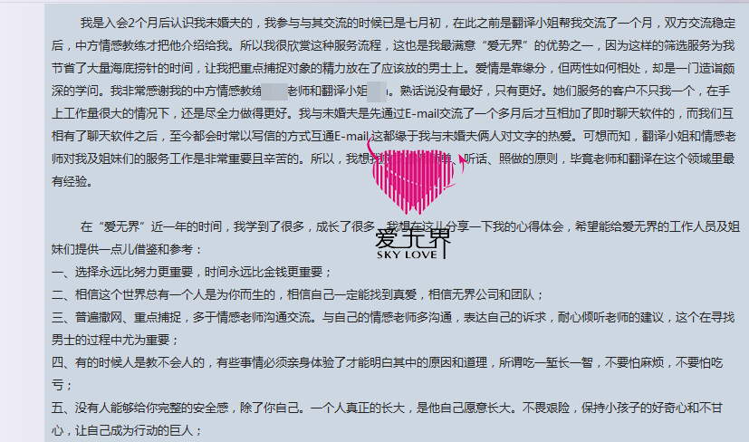 我是去年4月初加入贵司会员,从入会至今近一年的时间里,在贵司服务团队的带领下,我已找到了自己的Mr.Right,即我的真命天子。我能在这么短的时间里找到自己的真爱,这些都是与贵司服务团队邱顾问女士、情感教练老师、翻译小姐等工作人员对我的悉心帮助与耐心辅导分不开的。作为贵司的会员顾客,我真心诚意的感谢阿里红娘公司的领导及全体工作人员,在此向大家说一声“谢谢你们,你们辛苦了”。