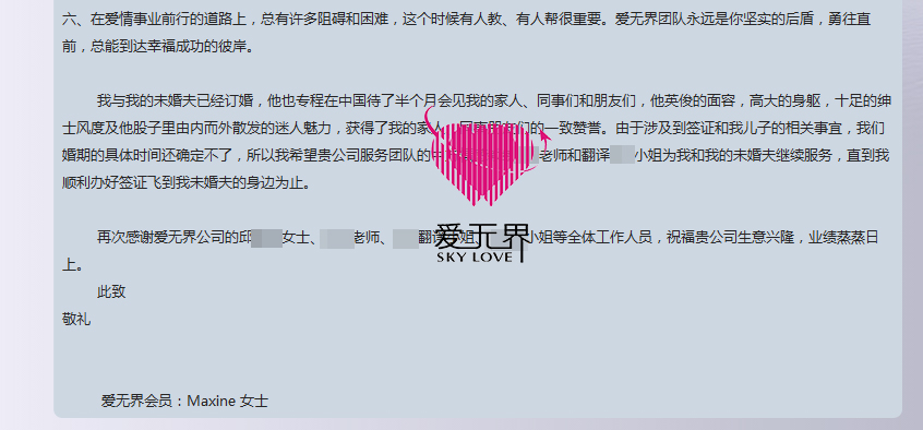 再次感谢阿里红娘公司的邱顾问女士、情感教练老师、翻译小姐等全体工作人员,祝福贵公司生意兴隆,业绩蒸蒸日上。