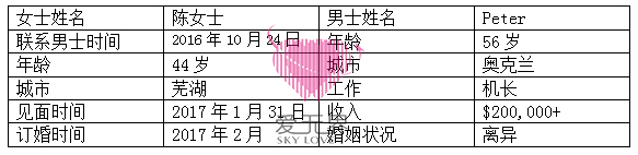 陈女士的缘分在2016年10月来了,教练推荐了来自澳洲新西兰的机长Peter!Peter今年56岁,来自奥克兰,是一名航空飞机师,1米76的个子,热情大方,一笑起来就能看到那一对深深的酒窝,他还是一名培训讲师,给企业授课,收入可观,也很注重生活品质。