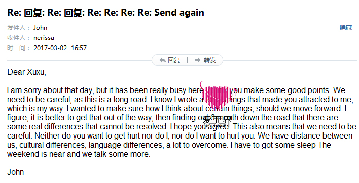 很抱歉一直没给你回复,但是最近的工作真的是太忙了。我认为你的想法很对。我们未来的路还很长,所以必须更慎重些。我知道我的信件让你喜欢上我,这也是我的方式哈哈!我希望在我们的关系打算更进一步之前,能够把很多问题都摊开来讨论。我想通过我们彼此坦诚的交流,双方都可以考虑是否关系可以进一步地发展;在接下来半年的日子中(男士的离婚手续预计在半年内搞定)了解彼此的差异,看看有没有什么不可协调的问题。我希望你能认同我的观点。这也意味着我们俩都要认真谨慎地对待我们的关系。我们彼此都不想伤害对方。我们还面临着距离、文化的不同、语言的差异,这些问题都需要我们日后去考虑。我先去睡了。周末快到了,我们会有更多的时间交流。