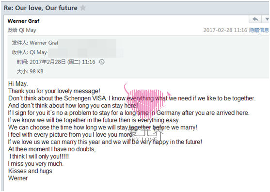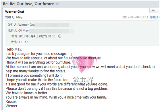 最近再次转回邮箱联系。他们已经有了第二次见面的计划(2017年4月),男士也有意愿结婚。女士也希望能把握住男士。(前面提到,女士在认识Werner的时候,同时在跟别的男士交流,女士更喜欢那两个男士)情感教练和翻译一直觉得另外两个男士并不够Werner好,Werner很爱她,她应该珍惜。兜兜转转,女士发现她在阿里红娘的时间不多了(快过期了),也慢慢地感觉到其实一直以来,Werner对她的爱一直没变。所以女士也越来越敞开自己的心,于是与男士聊到结婚这个问题。如果再次见面,大家的感觉都很好的话,他们今年会结婚吧。祝福他们!