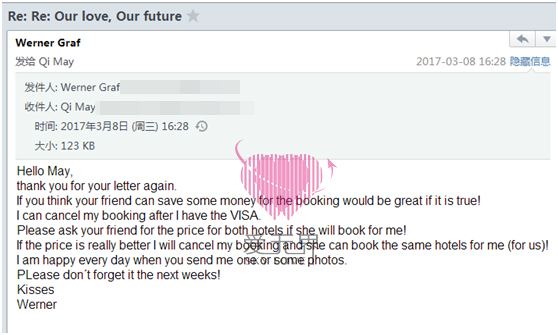 男士Werner,66岁,来自德国,女士来自河北承德,今年52岁。他们两个从2016年8月在平台上认识交流。一开始是邮箱中通信,男士非常喜欢女士的照片。对女士的印象非常好。但是由于女士当时还在跟别的男士交流,对Werner并不上心。但是很快男士就提出了来中国见面的想法。10月21日他们终于见上面了。他们一起游玩北京,然后去女士的城市承德。虽然女士当时并没有很喜欢男士,但是也一直跟男士保持私聊。