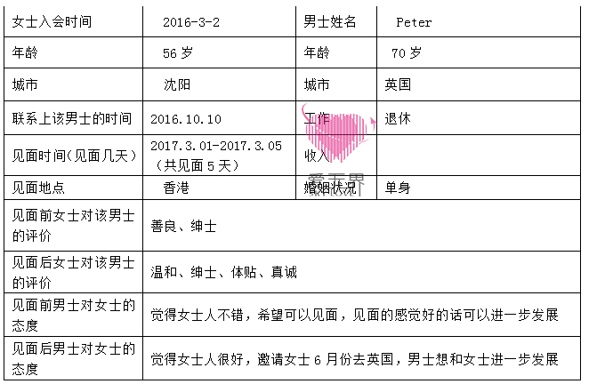 成功总是留给有准备的人的,果不其然,阿里红娘教练向季姐推荐了来自英国70岁的老绅士Peter,已经退休了的Peter,一刻也没让自己停下来。Peter热爱生活,热爱运动,热爱旅游,季姐被Peter这种积极向上的生活精神深深的吸引着。而季姐的美丽、温柔、善解人意也同样吸引着Peter,两颗真诚的心,上天注定的缘,就这样牵在了一起,他们彼此都在用心的,真诚的守护着这段感情。