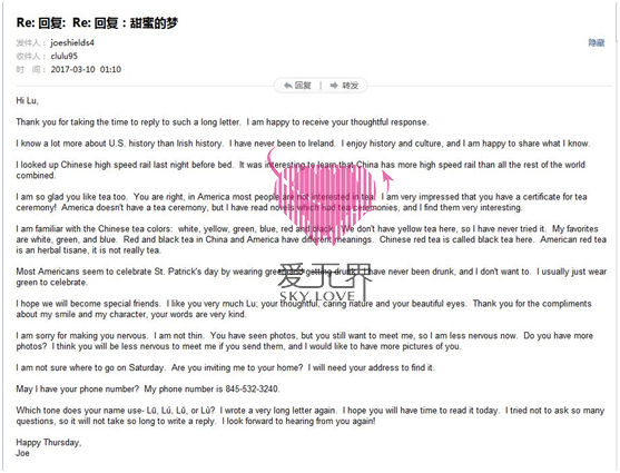 备注:男士来自美国纽约,43岁,是电脑芯片方面的技术员。女士来自中国北京,22岁,现在在美国纽约州留学。在交流的过程,两位对彼此的年龄差距以及不同的生活状态表现出了极大的包容,本着一颗真诚的心互相了解。男士很喜欢中国文化,得知女士喜欢茶艺,自幼学习中国民族乐器后,与女士有了更多的共同话题。女士对于自己的身材不是十分自信,男士在信中用温和的语言尽力打消女士的担忧,并表达了对两人见面的期待。