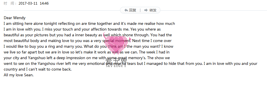 今晚我独自一人坐在这里回想咱们在一起的日子, 我意识到我有多爱你。 我想念你的抚摸和你对我的深情。是的,你和照片上一样美但是你的内在美使你更加的耀眼。你拥有最美的身材,和你最爱是最特别的时刻。 下次我过去时我会给你买戒指,娶你的。 你认为我是你要找的那个人吗?我知道我们离得远但是我们相爱了。让我们努力使我们的爱情开花结果吧。这周在你的城市和阳朔的日子给我留下了深刻的回忆。 我们在阳朔河边看的表演使我很感动,眼泪都快流下来了但是我在你面前尽力控制自己。 我爱着你,你的国家,我都迫不及待想回去了。