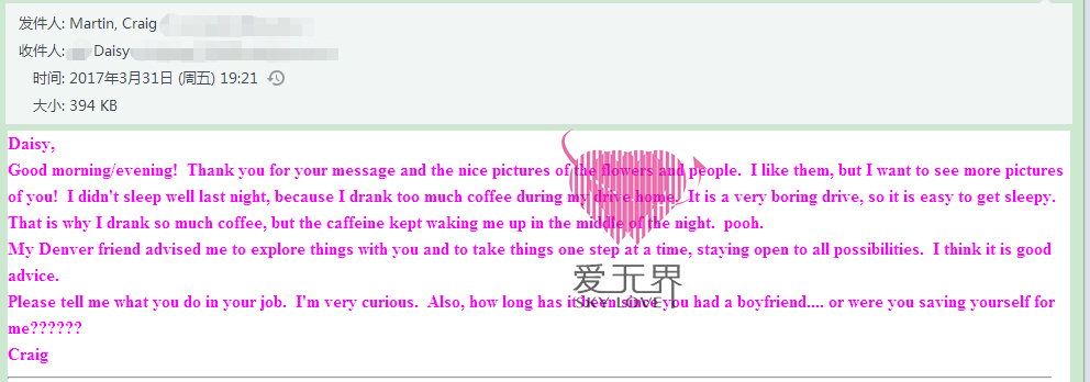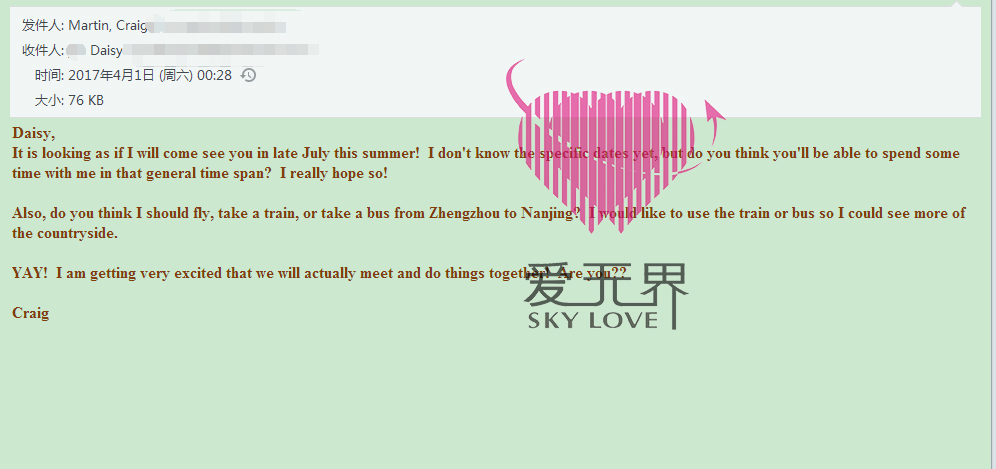 备注:男士今年63岁,来自美国,女士今年是49岁,来自江苏南京。在一开始的交流过程中,男士就被女士的江南女子的气质深深吸引住了,并且对女士的健康的生活态度和习惯着迷。女士对男士也很感兴趣,因为男士是一位从事生物研究已经35年的科学家,两人在精神层面的交流也很契合。男士也表示了会在7月底尽量安排时间去南京和女士见面,期待在灿烂的夏季的美好相遇!