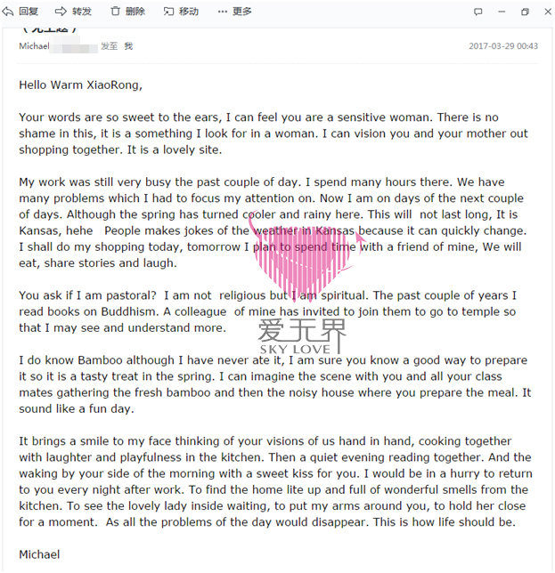 来自美国的Michael是一位58岁的机场大堂经理,或许是处于工作的习惯,为人温文尔雅,宠辱不惊,但是察言观色的洞察力不露声色的在与女士交流的过程中细致的展露出来,对于生活有着美好的向往,单身多年的他深切的渴望那位‘一心人’的出现,从此白首不相离。 随着两个人的频繁交流与互动,两个人的感情迅速升温,男士有过一段失败的恋爱,原因竟然是因为女方还没有准备好,不够勇敢的跨出第一步去拥抱幸福,而于女士则是早已经为爱情准备好一切,只为迎接那位对的人的到来,两人一拍即合,畅谈风花雪月,闲聊云卷云舒,指点万里江山,或许,伯牙和子琪就是他们最好的写照,当然,我们相信结局必定会如同比翼鸟那般双宿双飞。
