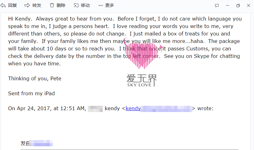 你好Kendy,很高兴收到你的来信。之前我忘记跟你说,我并不在乎你英语说的好不好,也不在乎你用什么语言跟我聊天,我喜欢的是你和你的内在,而且我也不想你刻意为我改变什么,你就做自己就好了。我寄了一些食品给你。我想如果你家人也喜欢我的话,你会对我更有好感吧,哈哈。这个包裹大概10天左右会到你那边,我想它只要通过海关检查,你就可以按照包裹上左上角的快递单号来查看物流信息了。当你有空时,希望能在Skype上与你聊天。
