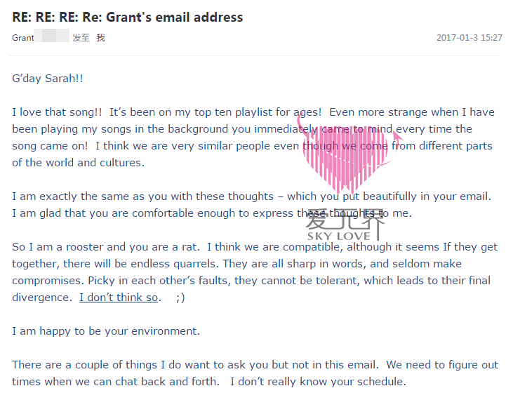 男士Grant来自澳洲,47岁。女士来自广州,44岁,年龄很相配。两人2016年12月28日在平台认识,一开始是在平台聊,男士被女士爽朗随和的性格所吸引,而女士也觉得男士很温柔体贴,是属于懂得照顾人的类型。只要女士一有不开心,男士立马感觉到了,并且主动跟女士说自己真的很喜欢她,希望只专注于她一个人,说会关掉平台。男士每天给女士在邮箱来信,并且跟她分享自己的兴趣爱好,喜欢的歌曲,电影,收藏的经典汽车等。 男士是个幽默风趣的人,他对女士的真心,女士很快能感受得到,慢慢的接受了男士,由于男士有一个年幼的儿子需要照顾,没有办法来中国见女士,男士便邀请女士五一到澳洲见面。女士已从澳洲见面回来,教练继续跟进情况,期待他们的后续发展!