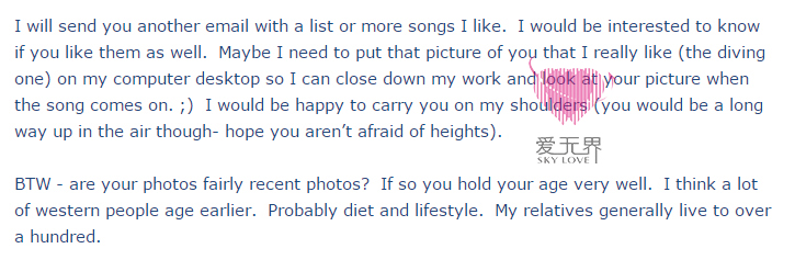 还有就是,你的照片都是近期拍的吗?如果是,那你保养得非常好。我觉得很多西方人都老得比较快,大概是饮食和生活习惯的缘故。我的亲戚们大多都活到一百多岁。