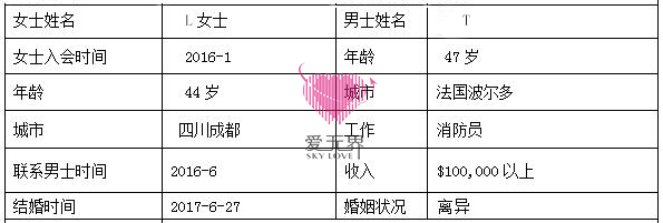 四川成都L女士和法国T,他们是去年6月下旬遇到对方的,因为男士真的很喜欢L女士,第一次见面后,两人相处的感觉都非常的好,同时也认定了对方就是自己要找的那个人,情投意合的两人很快便讨论起了结婚的事情,L女士原本打算去法国注册结婚的,但是由于手续过于麻烦,T便在2017年6月份飞到成都注册结婚!