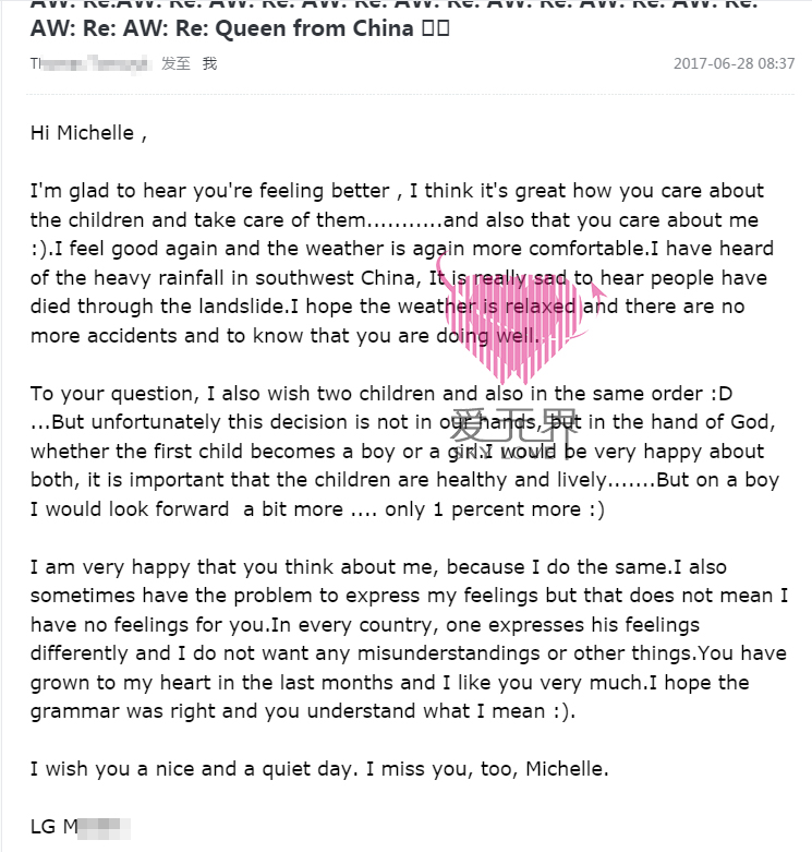 男士M来自德国,30岁。女士Michelle来自湖南衡阳,28岁。两人相识于2017年2月21号。男士是一名幽默风趣又不失风度的男人。因为男士来自德国,英语不是非常好,所以有时候的表达会造成女士的误会,但是男士每次都很愿意向女士解释说明,并且希望女士不要对他失去兴趣。男士打算十月份会来中国与女士见面,两人也在这个问题上讨论了很久。现在两人已经联系差不多半年了,男士每天都会给关心女士发来信件,分享每天所发生的趣事,最近两人还探讨起孩子的问题了,哈哈。