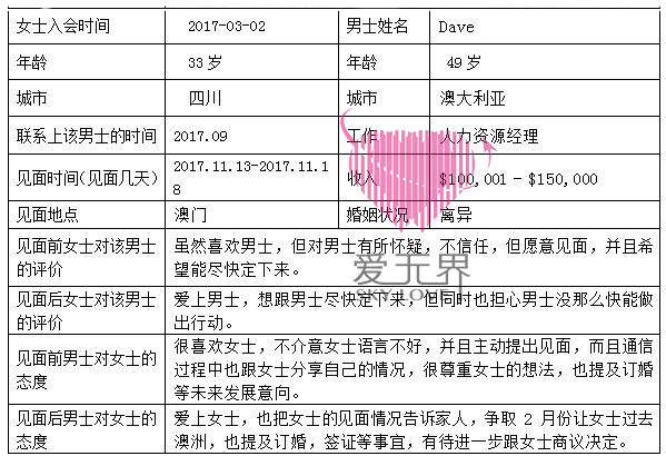 2017年9月,平台上收到来自澳洲Dave的主动联系,表示兴趣希望交流。翻译认真看过男士的资料后,进行初步的了解和信件交流。男士明确他上平台交友,想要发展一段认真的恋爱关系并且能到结婚的目的。