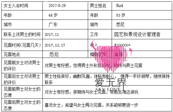 Rod男士来自悉尼,今年53岁,是一位园艺和景观设计管理者。悉尼爱之旅程出发前,Sophie与Rod每天都会视频,Rod期待Sophie的到来,他对Sophie说:"悉尼是个美丽热闹的城市,你会喜欢上它,欢迎你!只要你有需要,我就会出现!"Rod很主动问Sophie行程呢安排,这是计划要贴身陪同啊?!